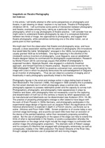 In this article, I will briefly attempt to offer some perspectives on photography and theatre, in part drawing on ideas I explore in my last book, Theatre & Photography (Anderson 2014). I will summarise some points of intersection between photography and theatre, examples among many, taking as a particular focus theatre photography, which is to say photographs of theatre practice. I will consider how we might come to understand theatre photography by way of a conceptual distinction between two kinds of image, two approaches to photography, and suggest that theatre photography, while sometimes reinforcing one or the other notion, can at points point to their synthesis.